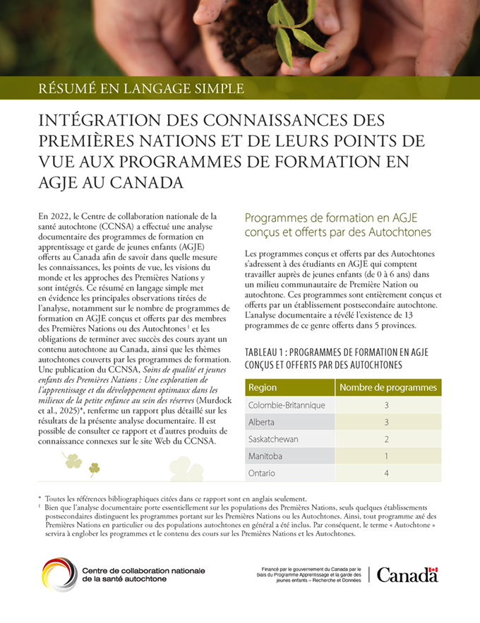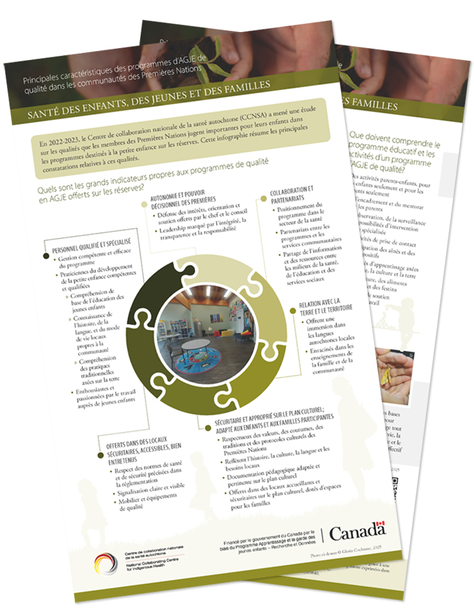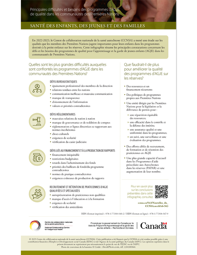 Soins de qualité et jeunes enfants des Premières Nations : une exploration de l’apprentissage et du développement optimaux dans les milieux de la petite enfance au sein des réserves présente les résultats d’un projet en trois parties amorcé par le Centre de collaboration nationale de la santé autochtone (CCNSA) en 2021. Le projet, qui fait partie d’une initiative pus large visant à inspirer et à renforcer les programmes et les politiques conçus pour desservir les familles avec de jeunes enfants dans les communautés des Premières Nations, comporte trois études qualitatives qui, séparément, se sont penchées sur les divers éléments qui caractérisent les programmes d’apprentissage et de garde de jeunes enfants (AGJE) destinés aux enfants sur les réserves. Toutes ces études avaient une portée nationale et concernaient précisément le Canada.