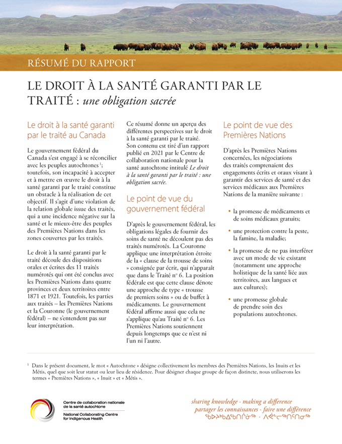 Le rapport intitulé Le droit à la santé garanti par le traité : une obligation sacrée répond à l’appel à l’action 18 de la Commission de vérité et réconciliation du Canada, lequel appel somme notamment tous les ordres de gouvernement de « reconnaître et d’appliquer les droits des Autochtones en matière de soins de santé tels qu’ils sont définis dans le droit international, le droit constitutionnel et les traités ». Le but de ce rapport est d’explorer plus à fond un aspect précis d’un casse-tête en soi beaucoup plus grand, à savoir le droit à la santé garanti par les traités.