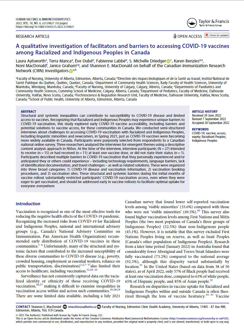 Aylsworth, L., Manca, T., Dubé, È., Labbé, F., Driedger, S.M., Benzies, K., MacDonald, N., Graham, J., & MacDonald, S.E., on behalf of the Canadian Immunization Research Network (CIRN) investigators. (2022). A qualitative investigation of facilitators and barriers to accessing COVID-19 vaccines among racialized and Indigenous Peoples in Canada. Human Vaccines & Immunotherapeutics, 18(6), e2129827.