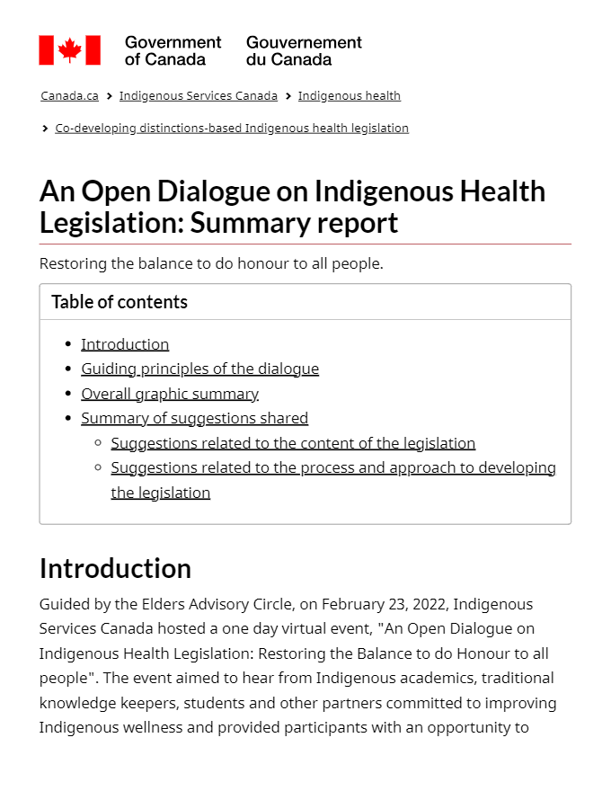 Services aux Autochtones Canad. (2022). Un dialogue ouvert sur les dispositions législatives sur la santé des Autochtones - Rapport sommaire. Gouvernement du Canada.