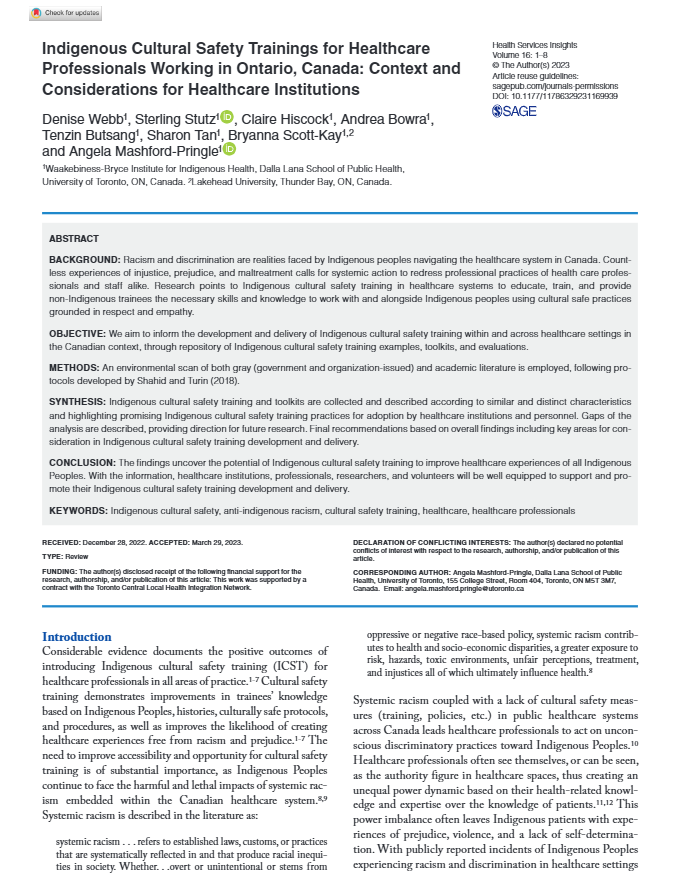 Webb, D., Stutz, S., Hiscock, E., Bowra, A., Butsang, T., Tan, S. Scott-Kay, B., & Mashford-Pringle, A. (2023). Indigenous cultural safety trainings for healthcare professionals working in Ontario, Canada: Context and considerations for healthcare institutions. Health Services Insights,16, 1-8. DOI: 10.1177/11786329231169939.