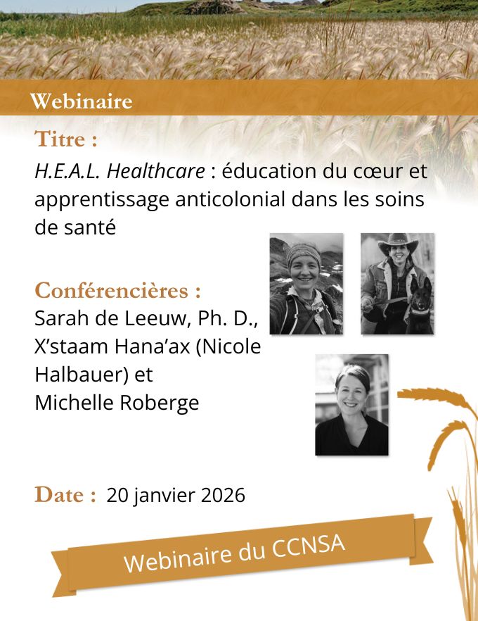 À compter du 30 mai 2019, le Centre de collaboration nationale de la santé autochtone (CCNSA) adoptera officiellement son nouveau nom en anglais, le National Collaborating Centre for Indigenous Health (NCCIH). Bien que le terme anglais « Aboriginal » soit un terme générique qui homogénéise souvent la diversité des peuples autochtones du Canada, le terme...
